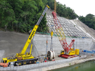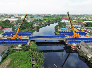 DEMAG AC500 and AC700 tandem lifting of steel girders at Karuhatan River along the new tollway.
