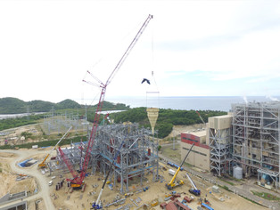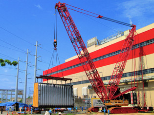 DEMAG 600 Ton Crawler Crane with Superlift and Luffing jib configuration installed various power plant components into the building