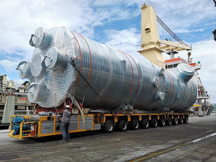 Goldhofer PST SL self propelled transporter carrying a Pre-Absorption module from shipside to erection site during the upgrade of the refinery...